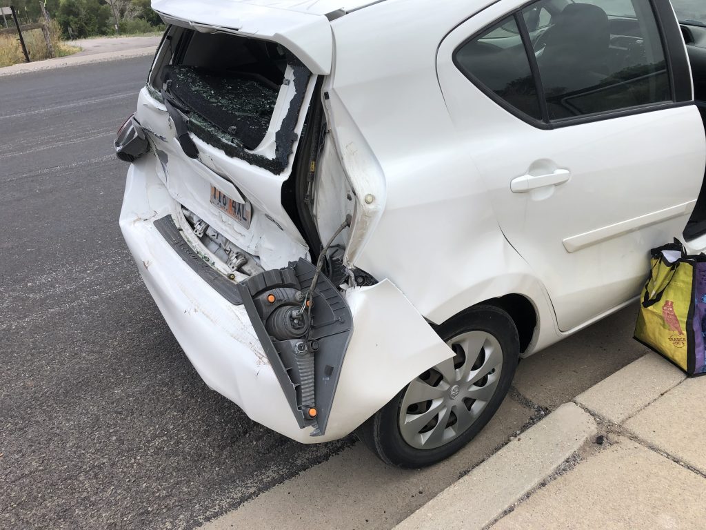He didn’t have a cell signal until he was at the mouth of the canyon down across the entrance to Wayne Bartholomew Park so he started to pull into a little parking lot there so he could text or call us. As he slowed down and pulled in, an older full-size van rear-ended him.