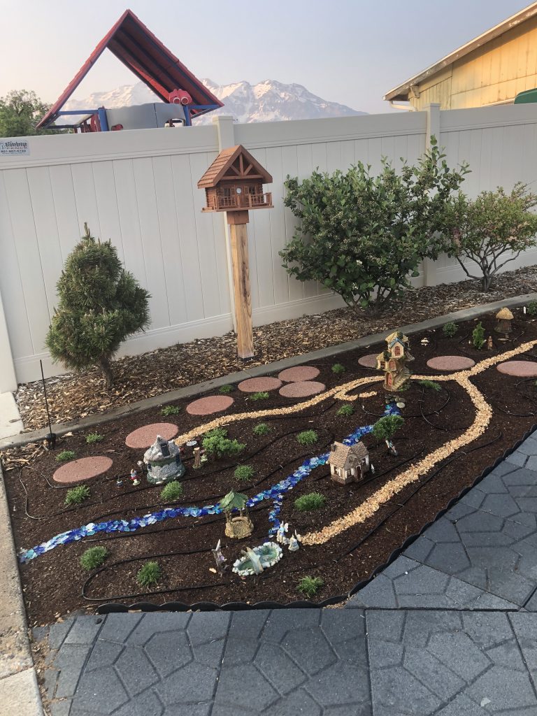 We have been working a lot on our side yard (mostly Norm) and we finally finished it. It has a lot of flowering bushes on most of it with some paths between and then a fairy garden with a geocache hidden in a birdhouse.