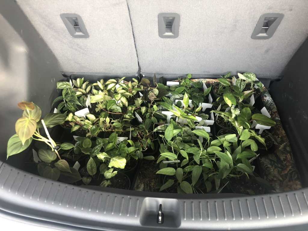 Then on Friday, I gathered all the plants I wanted to bring to the swap. I brought one of all the plants I had ready and then a few extras I had more than one of that type ready to bring. I was excited because my four-foot table fit in the back seat of Bolt, along with some misc. items like camping chairs and all my plants fit snugly in the trunk.