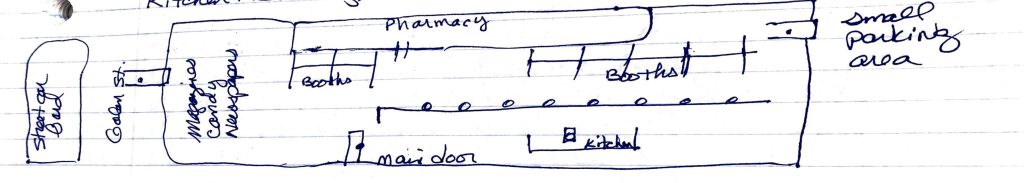 As you walked in the main door of the store, the cash register and cigarette sales were on the right; then the soda fountain; and the pharmacy was across to the other side. There were 12-15 booths in the store and approximately 10 stools at the soda fountain. Behind the soda fountain was a swinging door with a circular window which led to a very small kitchen. During lunch time, Auntie Ange cooked back there.