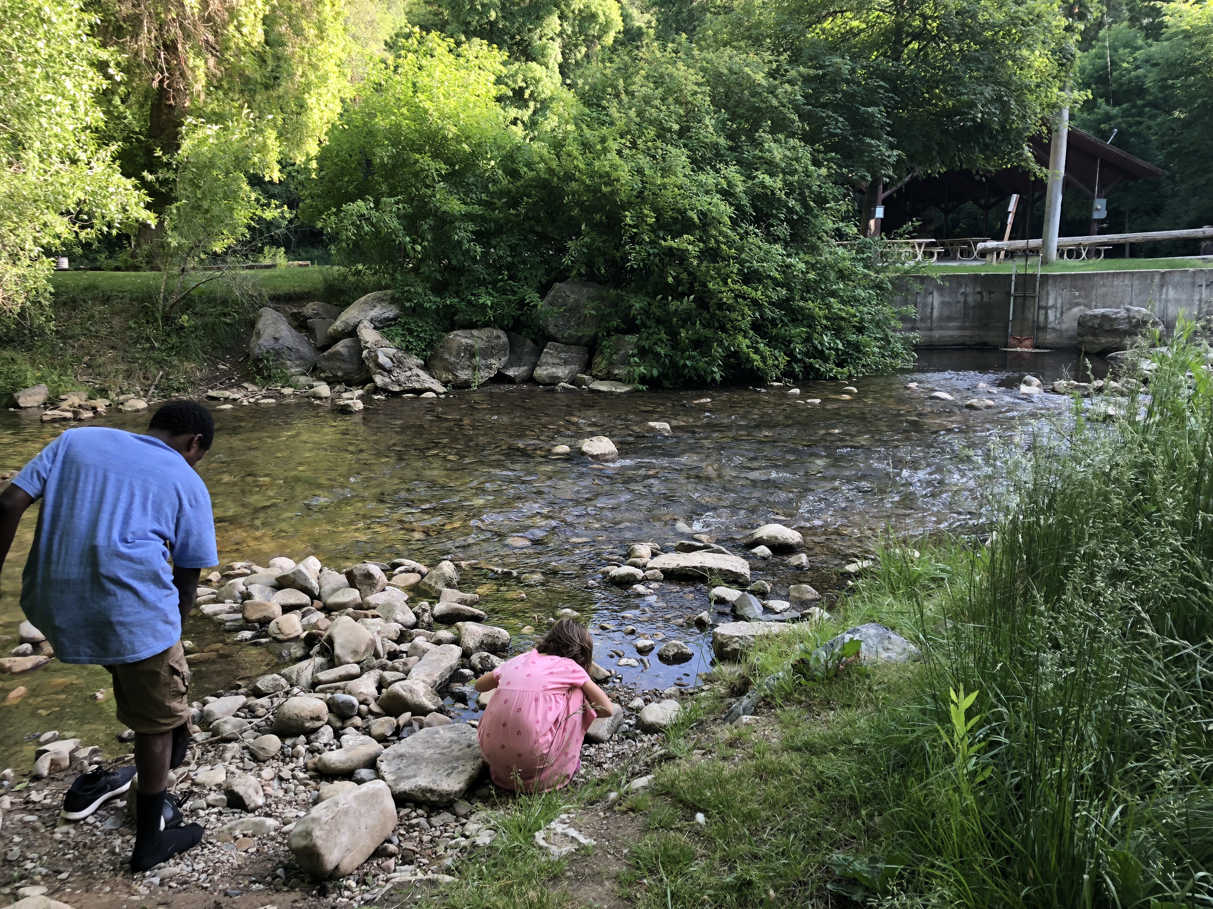 To get to the river, you walk down the hill, across the field, across the street and a little picnic area and then there is this nice little area to get in the river – so bring clothes to get wet or a swimsuit!
